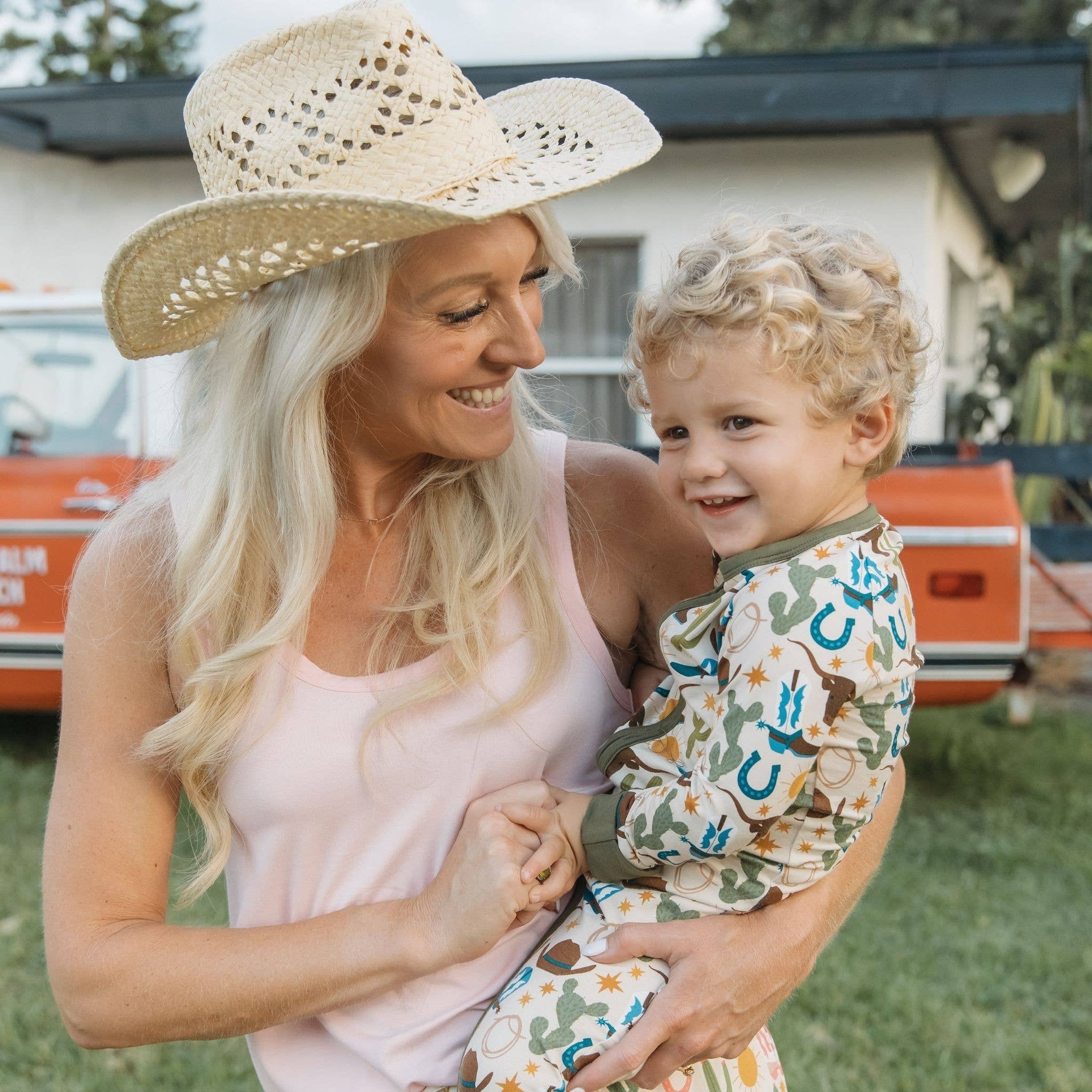 The softest bamboo baby pajamas in our new Howdy western pattern! This fun print full of cacti and cowboy gear is perfect for spring and summer. Check out more with this print for the cutest sibling match, and don't miss our new Hey Y'all western print as well! * SWEET DREAMS: Made from high quality bamboo, our baby pajamas are the recipe for a perfect night's sleep. Our bamboo pajamas start with our signature buttery soft bamboo/spandex blend that has the perfect amount of stretch for the most comfort. * FEATURES: Our two-way zipper design makes late night changes a breeze. Our pajamas include many comfort features, such as fold-over sleeves to keep baby from scratching, fold-over feet to keep toes warm, and printed neck label and neckline zipper protection.