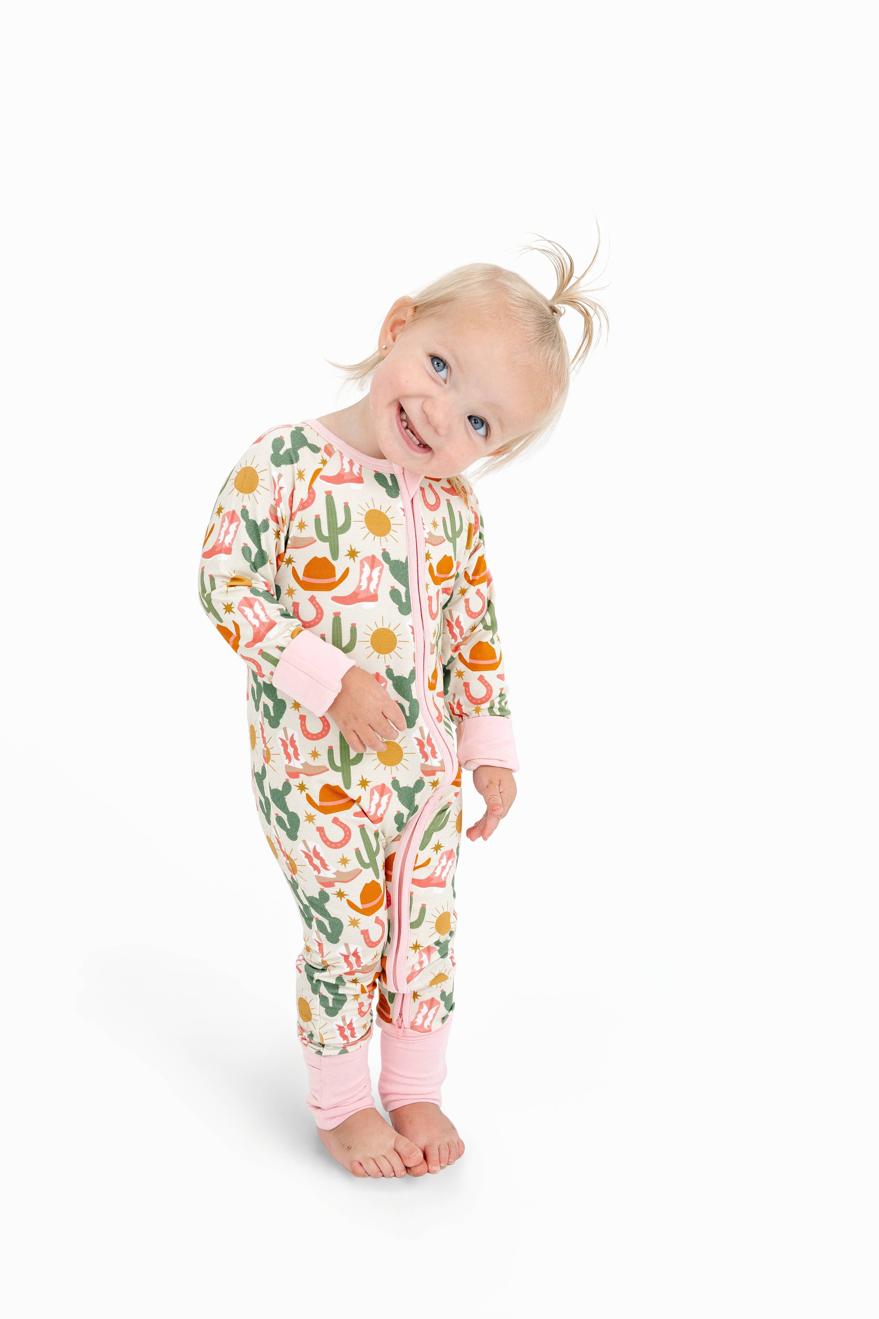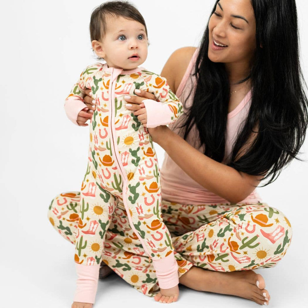 The softest bamboo baby pajamas in our Hey Y'all western pattern! This fun print full of cacti and cowgirl gear is perfect for spring and summer. Check out more with this print for the cutest sibling match, and don't miss our Howdy western print as well! * SWEET DREAMS: Made from high quality bamboo, our baby pajamas are the recipe for a perfect night's sleep. Our bamboo pajamas start with our signature buttery soft bamboo/spandex blend that has the perfect amount of stretch for the most comfort. * FEATURES: Our two-way zipper design makes late night changes a breeze. Our pajamas include many comfort features, such as fold-over sleeves to keep baby from scratching, fold-over feet to keep toes warm, and printed neck label and neckline zipper protection.