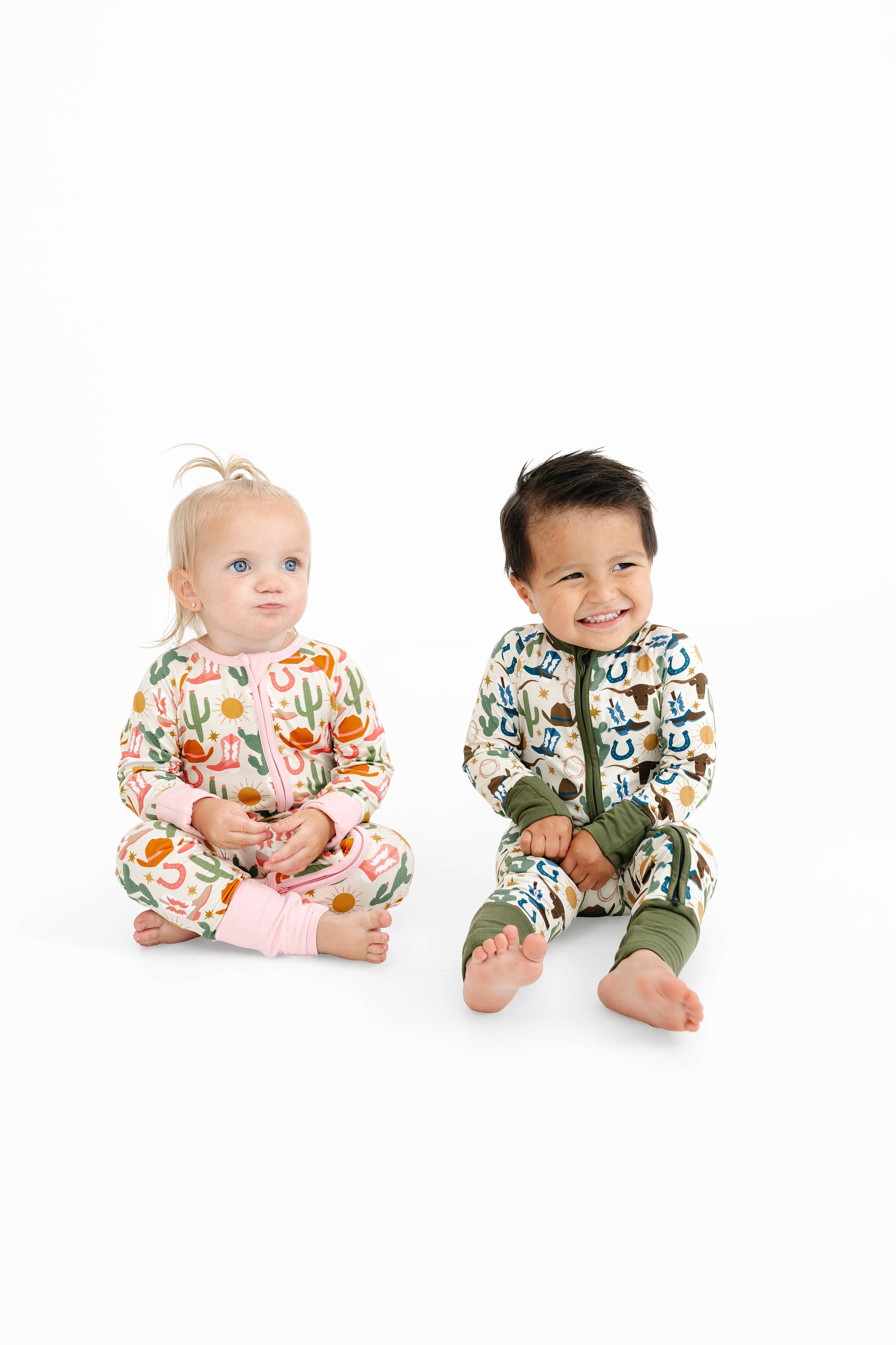 The softest bamboo baby pajamas in our Hey Y'all western pattern! This fun print full of cacti and cowgirl gear is perfect for spring and summer. Check out more with this print for the cutest sibling match, and don't miss our Howdy western print as well!