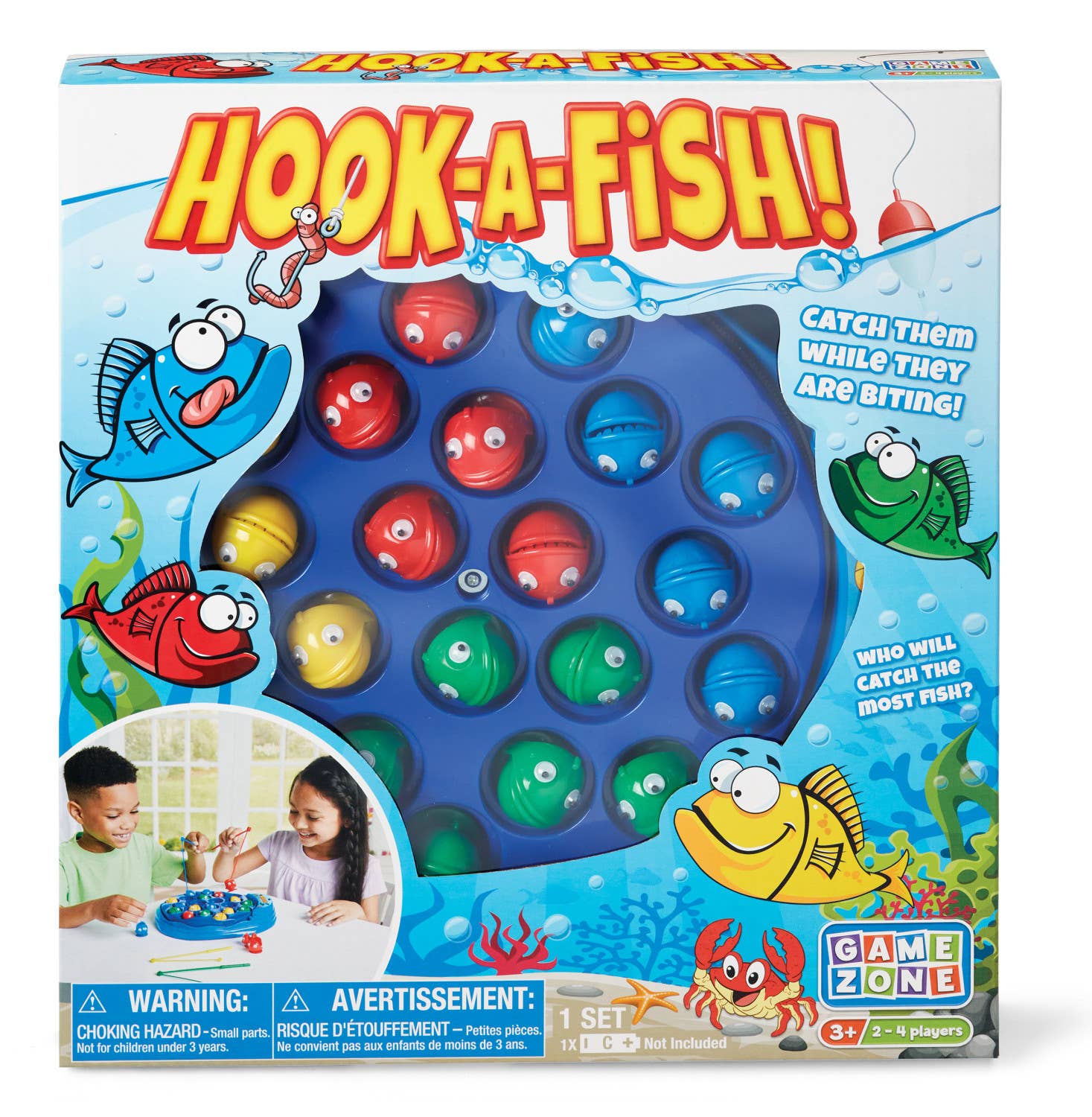 This is the classic fishing game which been around for years. As the base rotates, the fish pop up and open their mouths to eat. Catch as many fish as you can! Catch as many as you can. Who can catch the most fish in 1 minute. Catch all the fish that match your fishing pole color. Each color fish is worth a different amount, whoever has the most points wins. This is a classic game that is great for the entire family. It combines skill and hand-eye coordination to catch the fast moving fish as the pond turns. Package contains one rotating game base, 21 colorful fish with opening mouths and 4 fishing poles. Requires 1 "C" battery (not included). Recommended for adults and children ages 3 and above. For 2 - 4 players.