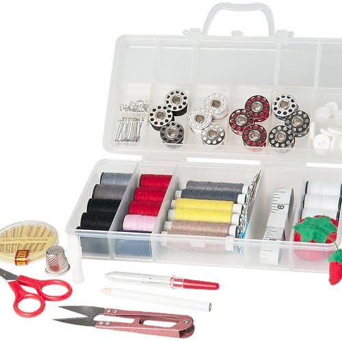 SEW SIMPLY TO COUNT ON - YOUR KIT INCLUDES 13 spools of thread, 3 white, 3 black, 1 Navy, 2 Pink, 3 Red, 4 Gray, 2 Beige, 2 Yellow, Additional 12 Bobbins Included 20 yards each - 12 Hooks & eyes - Safety pins - Fasteners, Seam ripper - Marking pencil/brush - 60" Tape measure - Pincushion - Snip cutter - Needles - Thimble - Shirt & Regular buttons