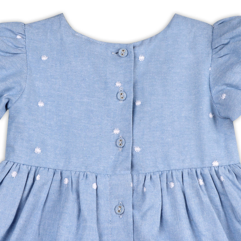 Button opening in the back adds a functional element and enhances the dress's classic appeal. The dress features a cotton voile lining for ultimate comfort, ensuring a soft and gentle feel against your little one's skin. Paired with the dress is a matching bloomer, complete with bobbles for a perfectly coordinated ensemble. Whether a special occasion or a casual outing, this Chambray Baby Dress captivates hearts and turns heads. Embrace the beauty of timeless craftsmanship and delicate details with this enchanting ensemble, destined to become a cherished addition to your little one's wardrobe.